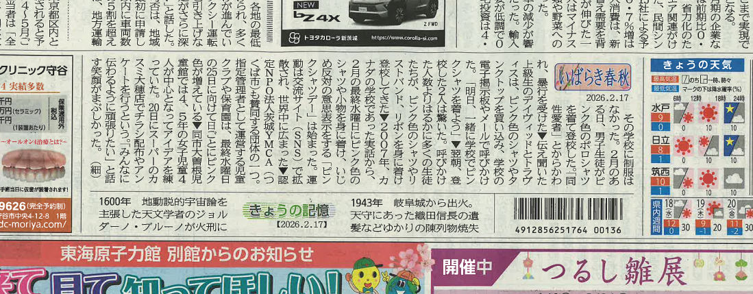 ピンクシャツデーの取り組みを、茨城新聞の新聞コラム「いばらき春秋」に取り上げていただきました。