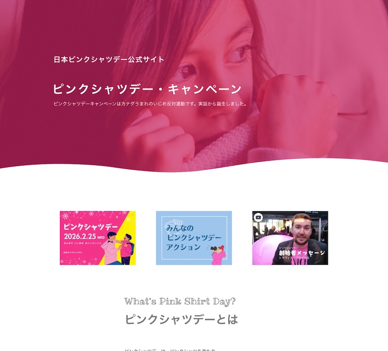 子どもたちや皆さまと一緒に、そのような大切な気持ちに関する様々なことについて考えながら、よりよい社会を目指すひと時となりますことを願っております。 また、ピンクシャツデー当日はもちろん、二月中は皆さまピンク色の服や小物を身に着けていただき、ぜひこのピンクシャツデーの気持ちに共感を表していただけますと幸いです。